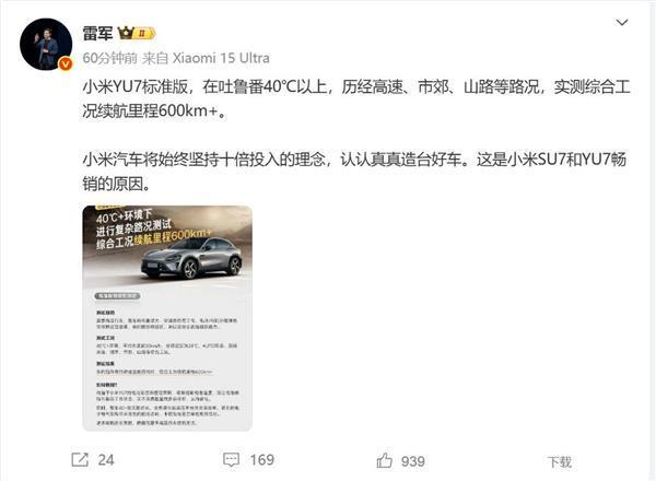 雷军强调,小米汽车将始终坚持十倍投入的理念,认认真真造台好车,这是小米SU7和YU7畅销的原因。相较于燃油汽车,智能电动汽车还处于发展的初期,在小米进入相关领域前,国内和国外已经有先行者进行了探路,不过小米依旧会坚持“守正出奇”的原则:充分尊重汽车行业的规律,使用行业成熟技术确保把车做好,再在这个大前提下创新,打通人、车、家全生态。(快科技)