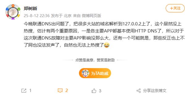 8月13日消息,8月12日晚,多地联通用户(以北京为主)在社交平台反馈称,联通网络出现崩溃,部分网站和App无法访问。有网友表示,“八点多那会在公司也遇到了,抖音和微博网页都打不开了”“我在给汽车雨中充电,正付钱突然寄了。”有博主指出:“联通DNS被污染,一大堆域名被污染解析到127.0.0.2 。”“联通DNS出问题了,把很多大站的域名解析到127.0.0.2上了。”