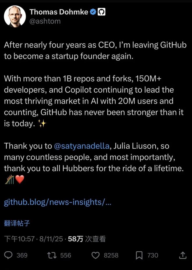 当地时间 8 月 11 日,GitHub 首席执行官 Thomas Dohmke 通过内部信宣布,将于 2025 年底卸任 CEO 职务,投身新的创业项目。GitHub 未来将继续作为微软 CoreAI 组织的一部分推进业务,由现有领导团队接手。Dohmke 在 X 上表示:“GitHub 今天比任何时候都更强大。无论是平台生态、开源贡献,还是 AI 赋能的开发体验,我们都走在行业最前沿。卸任并不是结束,而是一次新的起点。”自2018年微软以75亿美元收购以来,GitHub首次失去「子公司」身份,成为CoreAI的一部分。Dohmke将留任至年底协助交接,随后重启创业。CoreAI由前Meta高管Jay Parikh掌舵,目标是打造面向企业与开发者的「AI智能体工厂」。这就传递出一个重大信号:GitHub的独立旗帜正式降下,全球最大代码托管平台正沦为微软AI时代的「武器库」。