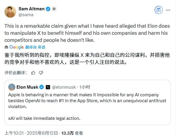 8月12日,OpenAI CEO奥特曼在X平台转发了“马斯克威胁将对苹果采取法律行动”的发文,并就此表态,我听说有人指控马斯克通过操纵X来谋取个人及公司利益,并损害其竞争对手,这一指控令人震惊,希望有人能针对此事展开调查。此前,在当地时间8月11日,马斯克在X平台发文称,“X 平台是全球排名第一的新闻应用,而 Grok 在所有应用中排名第五,为什么苹果公司拒绝将 X 或 Grok 列入 App Store‘必备’类别?你在玩弄吗?究竟是怎么回事?好奇的人们想知道答案。”